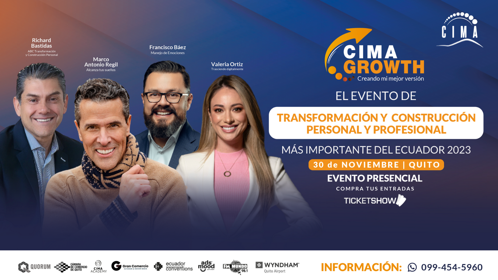 Un evento diseñado para crear las bases y los nuevos hábitos que llevarán a los participantes a vivir su mejor versión fundamentrados en la disciplina, conciencia emociones y maneras de ser.  CIMA GROWTH maneja una metodología Kaizen que además  combina elementos de desarrollo profesional y personal con dinámicas de trabajo en equipo y actividades lúdicas de una manera PRÁCTICA,  manejado con potentes speakers Internacionales, un día lleno de mucho contenido de valor que cubren áreas sensibles en la vida del directivo empresario, desde la base hasta la ejecución.